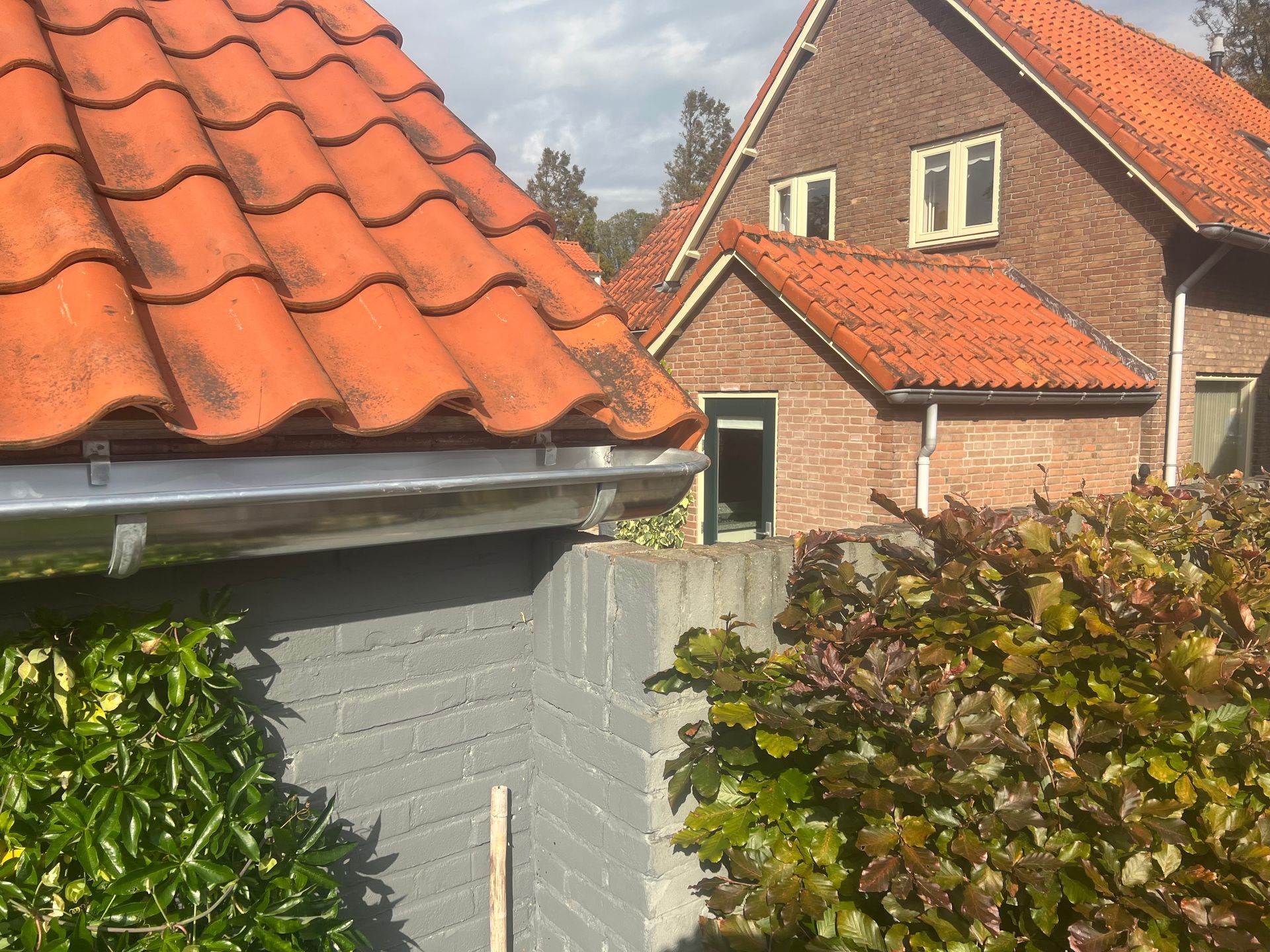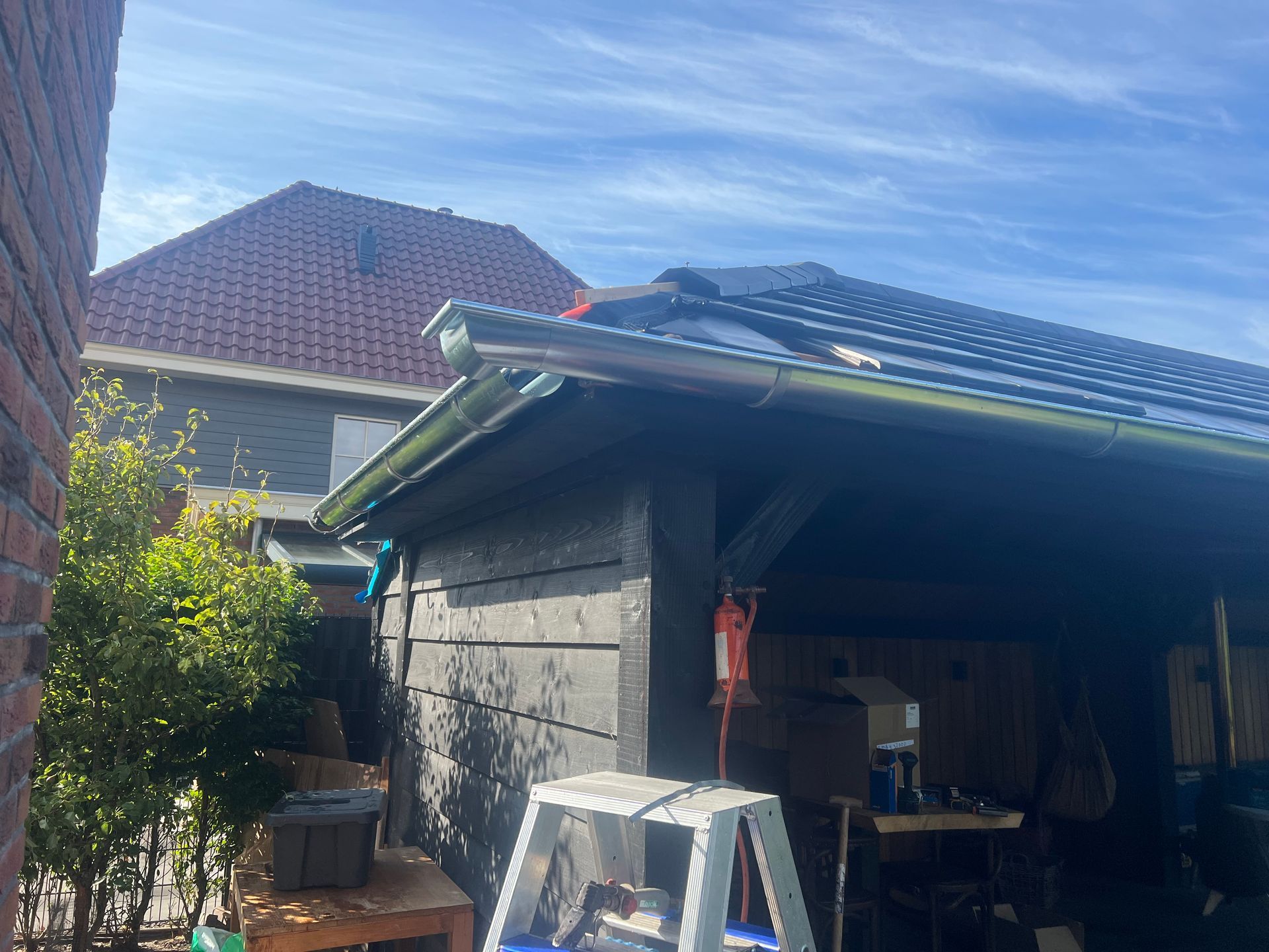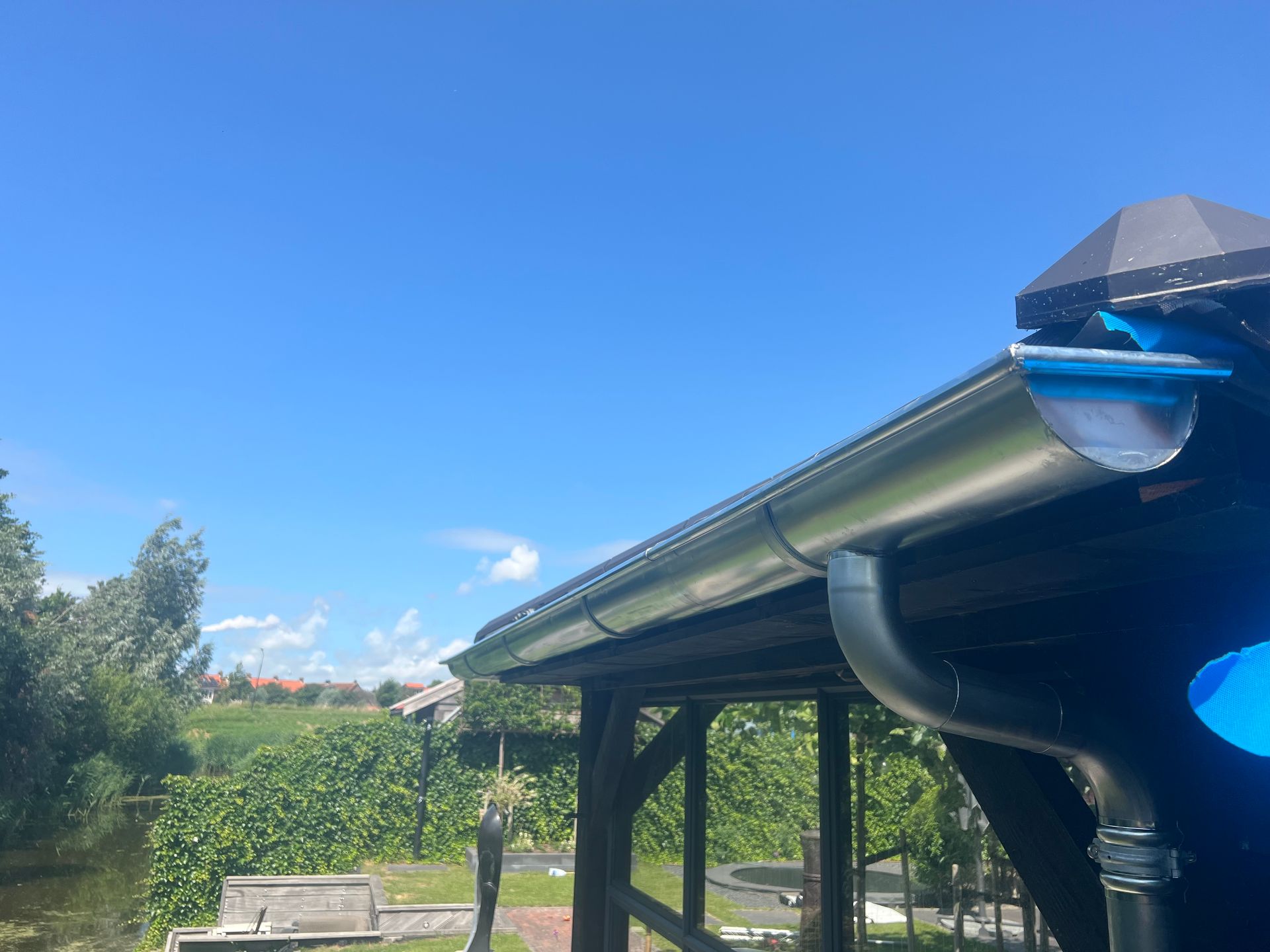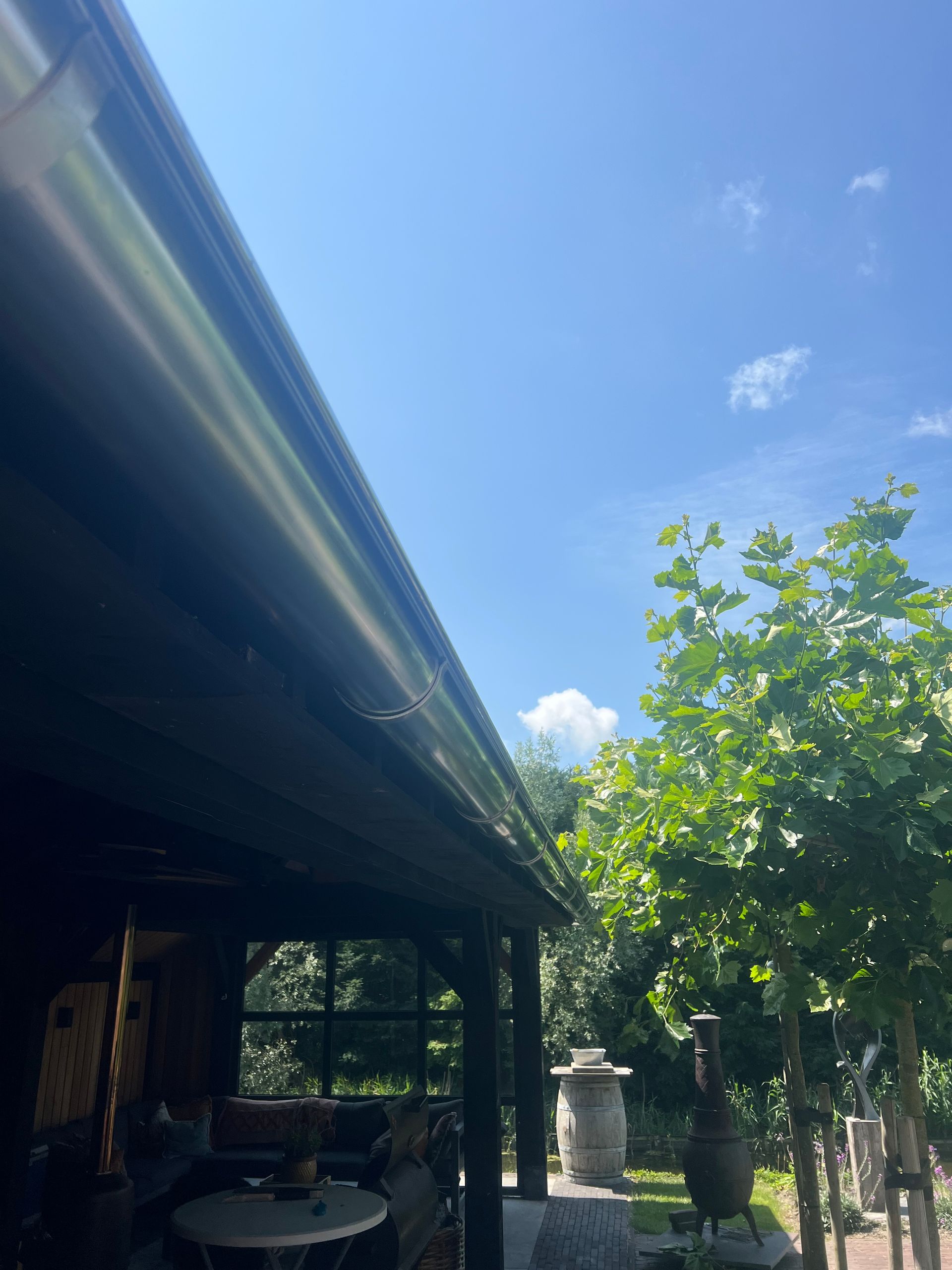 Zinken mastgoten rondom een prachtige veranda in Heerhugowaard. Ook zijn er 2 zinken hemelwaterafvoeren aangebracht met dubbele wrongen.